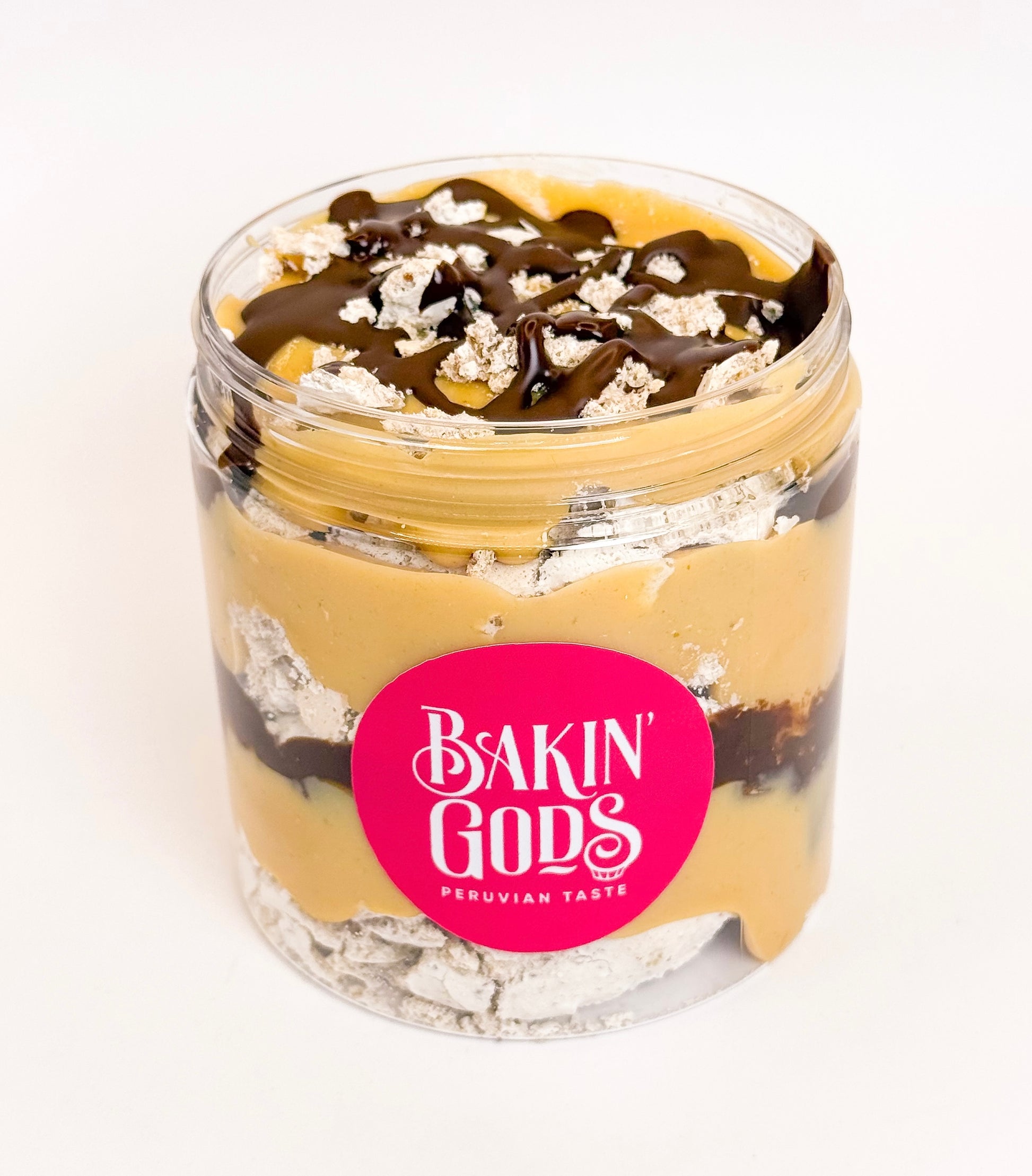 My mom’s favorite. Three layers of baked pecan meringue cookie filled with three layers of homemade chirimoya dulce de leche and covered with 55% chocolate drizzle.